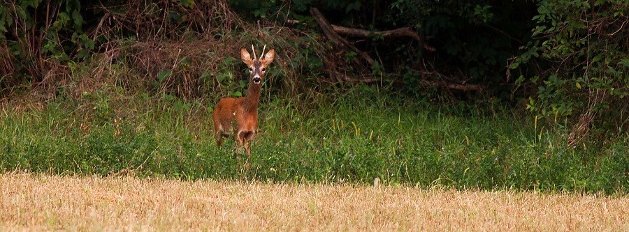 Prišli sme ku poľovníkovi, v koho revíri mal ujo uloviť srnca. Po milom uvítaní sme vyrazili do revíru. Uja sme s prianím úspešného lovu vysadili na jeho mieste, a my s poľovníkom sme pokračovali ďalej. O chvíľu sme boli na kraji "nášho" poľa. Tam sme nechali auto a prešli sme popri lese k nízkemu posedu v strome. Tam nás poľovník nechal a on pokračoval ešte ďalej. Sadli sme si ku stromu pod posed, aby sme mali dobrý uhol a čakali sme čo sa bude diať. Pred nami sa rozkladalo v celku malé pole pokryté strniskom obklopené zalesneným stúpajúcim svahom. Nič nevychádzalo a svetla začalo ubúdať. Keďže sme nemali zo sebou statívy, iba monopody, rozhodli sme sa vyjsť na posed, kde by sme sa mohli pevnejšie oprieť a zabrániť tak rozhýbaniu fotky. Krátko pred 20:45 vyšiel z lesa mladý srnec vo vzdialenosti asi 80m.