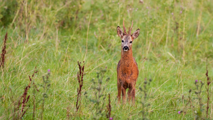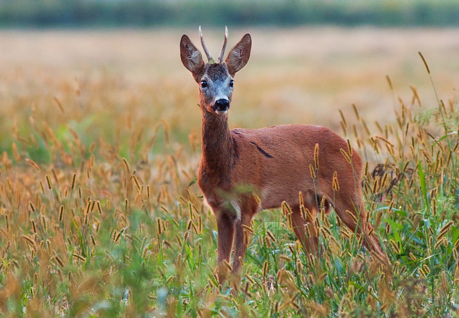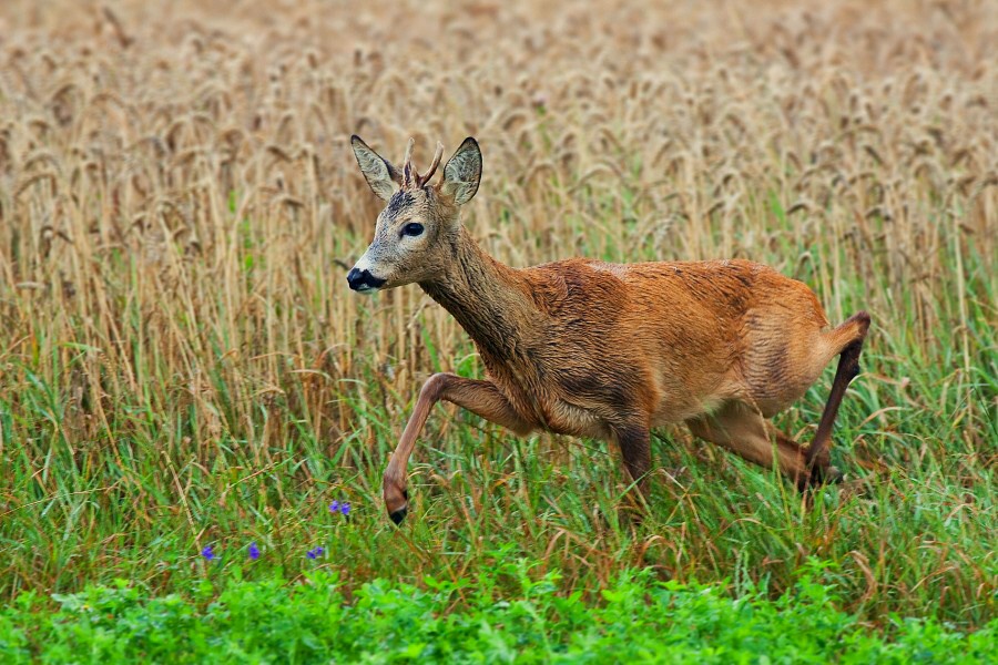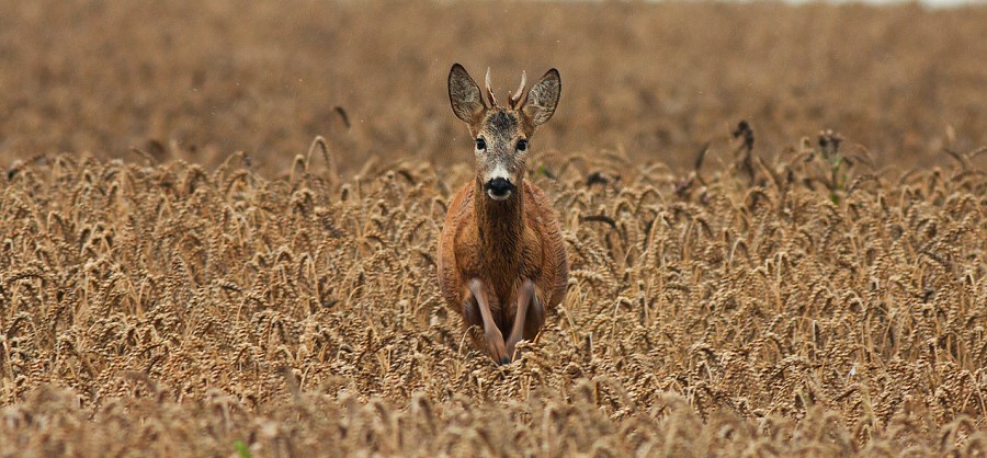 Pár ďalších písknutí a kus bežal miernym oblúkom smerom k nám. Vbehol do obilia, ktorým sme sa pred chvíľou predierali my a stále sa približoval. To už sme videli že to nie je srna ale mladý srnec.