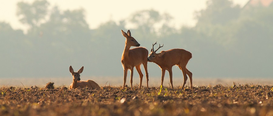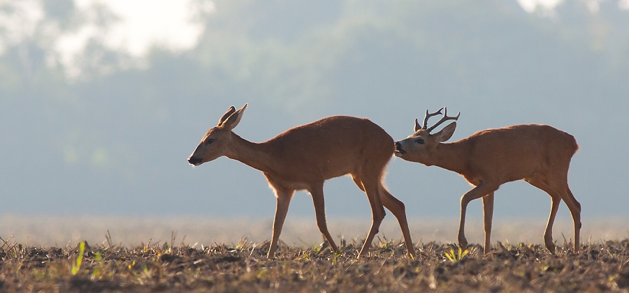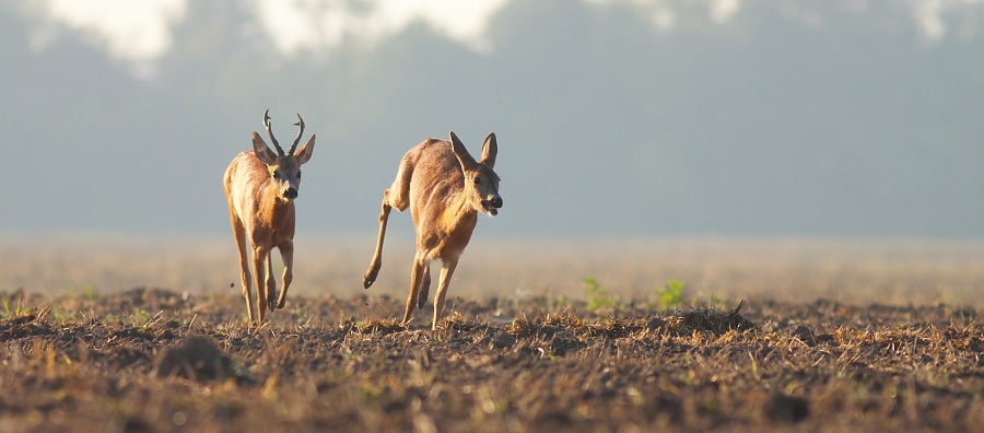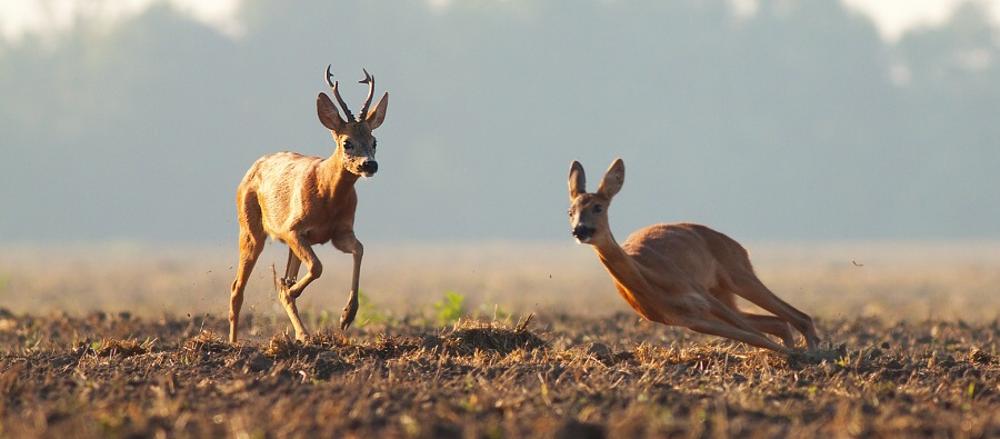 Mali sme obrovské šťastie, že sa rozhodla zájsť do lesa práve v mieste kde sme sedeli my. Po tejto príhode sme sa rozhodli skúsiť šťastie šúlaním. Išli sme pomaly po kraji lesa keď z neho zrazu vyrazila srna. Pri prudkom štarte stratila rovnováhu a pri doskoku mala problémy so stabilitou. Vyzeralo to že spadne, nakoniec to však ustála a pokračovala v behu. Za ňou sa vyrútil aj srnec. Keď sme ho zbadali srdce nám podskočilo. Bol to on, náš kamarát z jari, Kališnik. Meno dostal podľa tvaru jeho parožia, ktoré pripomínalo kalich. Kališnik o nás našťastie nevedel a nechcel aby mu jeho rujná družka utiekla moc ďaleko. Preto ju obehol a zabránil jej v ďalšom bezhlavom úniku. Chvíľu sa naháňali v typických rujných kruhoch. Srna začala spomaľovať a nakoniec zastala úplne. To bolo znamením pre Kališnika, že prišla ta pravá chvíľa. Po krátkom párení zamilovanci zaľahli na pole asi 150 metrov od nás. Na fotenie to bolo moc ďaleko. Keďže sa to celé odohrávalo na pooranom poli, bez porastu, nemali sme sa za čo pri približovaní schovať. Jediná možnosť ako niečo nafotiť bola priplaziť sa aspoň o 100m bližšie. Dúfali sme, že rujný pár bude zaujatý naháňaním sa, a nevšimnú si nás. Boli sme asi v polovici cesty keď z lesa vybehla ďalšia srna, a zamierila k rujnému páru. Keď sa k nim priblížila Kališnik ju začal naháňať, a o "starú" sa prestal zaujímať. Bola asi rujnejšia, a preto pre Kališnika atraktívnejšia.