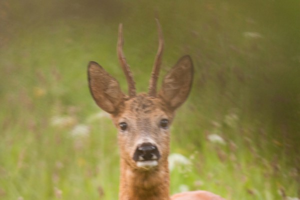 Na konci ruje sme s celou rodinou išli na spoločnú dovolenku na Šumavu. Nádherná príroda nás lákala von, a hneď prvý večer sme išli na prieskum okolia. Prišli sme do lesa a skúsili vábiť, ale nič neprišlo. Cestou spať sme na lúke neďaleko prvých domov zbadali srnca so srnou. Kým sme prišli bližšie, stratili sa nám z dohľadu. Pripravili sme sa na fotenie a začali vábiť. Spoza kopčeka sa k nám rozbehol srnec, ktorý prišiel až na vzdialenosť okolo 8m. Ale nemohli sme fotiť lebo bol za kríkom. Dokumentačná fotka, ktorá ukazuje ako blízko srnec priskočil. Žiaľ svetla bolo už málo a v kombinácii s konárikmi pred objektívom z toho vyšla len takáto mazanina. Foto bez orezu.