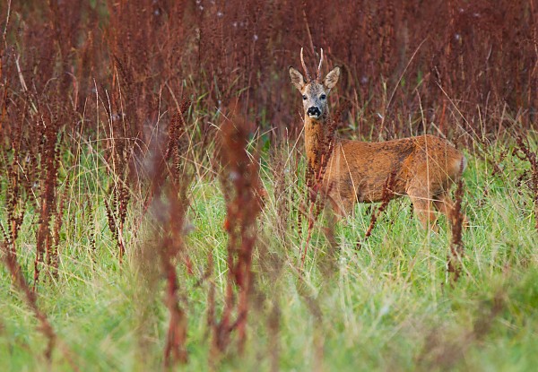 Keď srnec konečne vykukol spoza kríku trochu sa zľakol a odskočil na asi 20m. Predsa len, očakával že tam nájde, rujnú družku a namiesto toho zbadal 2 divné zelené veci. Na chvíľu zastal a istil našim smerom. To bol ten pravý čas na fotenie. Nakoniec srnec odskočil, ale to už bol uložený na našich pamäťových kartách.